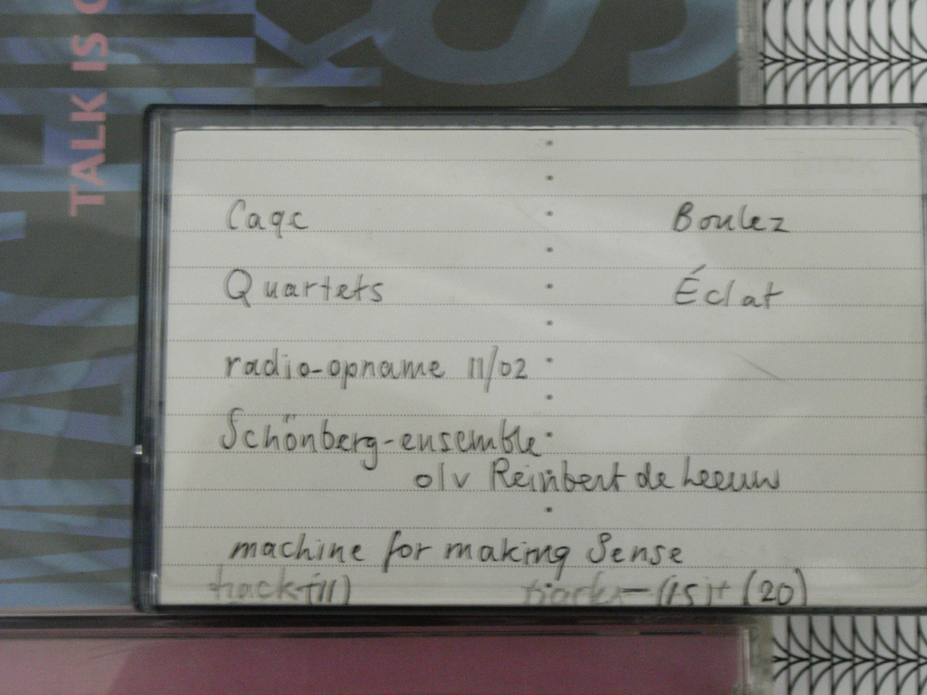luisterend naar een tape van een radio-uitzending van John Cage Quartets, door het Schönberg-ensemble o.l.v. Reinbert de Leeuw, ontdekte ik een paar tracks die ik erachteraan had opgenomen, van de cd Talk is Cheap (1997) door Machine for Making Sense: violin, hurdy gurdy, electronics, vocals, digital and analog tape manipulations. Amanda Stewart, een van de bandleden en ook dichter, had ik gehoord in de hal bij Poetry International en daar moest ik meteen meer van horen. Stevie Wishart bespeelt (o.a.) de draailier en is zelf componiste.